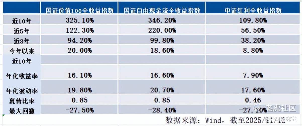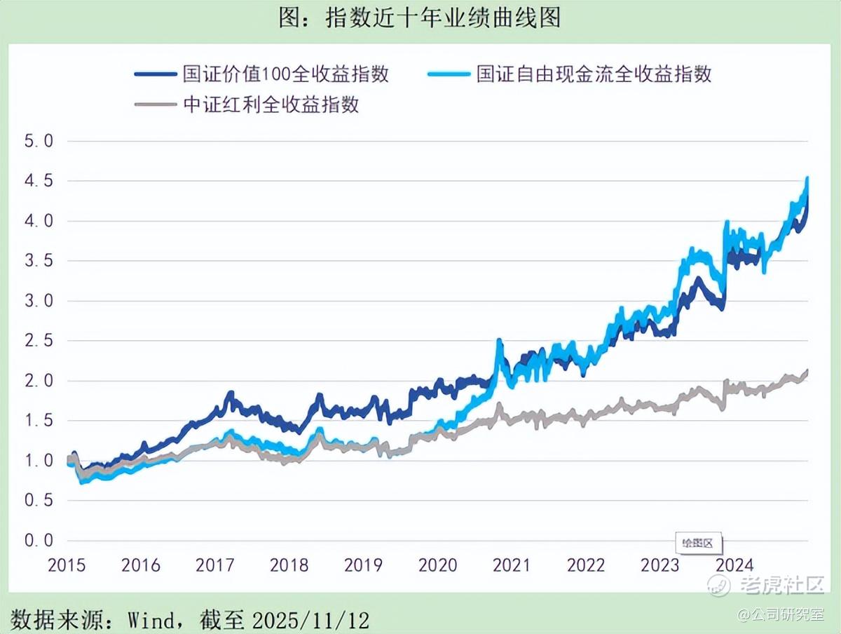 Wind数据显示,截至2025年11月12日,国证价值100全收益指数近十年(2015.11.13-2025.11.12)涨幅325.10%,年化收益率16.10%;国证自由现金流全收益指数涨幅346.20%,年化收益率16.60%;中证红利全收益指数涨幅109.80,年化收益率7.90%。