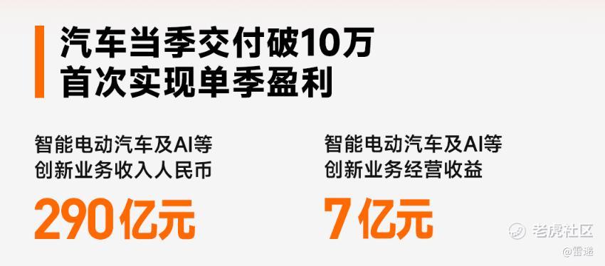 智能电动汽车及AI等创新业务分部收入290亿元,同比增长超199%。其中智能电动汽车收入283亿元,其他相关收入7亿元,并且本季度小米汽车及AI等创新业务分部首次实现单季度经营收益转正,实现单季经营收益7亿元。