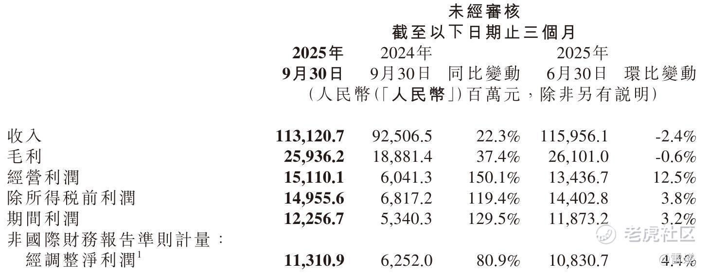 小米集团2025年第三季度经营利润为151.1亿元,较上年同期的60.41亿元增长150.1%;期内利润为122.56亿元,较上年同期的53.4亿元增长129.5%;经调整净利为113.11亿元,较上年同期的62.52亿元增长80.9%,较上一季度的108.31亿元增长4.4%。