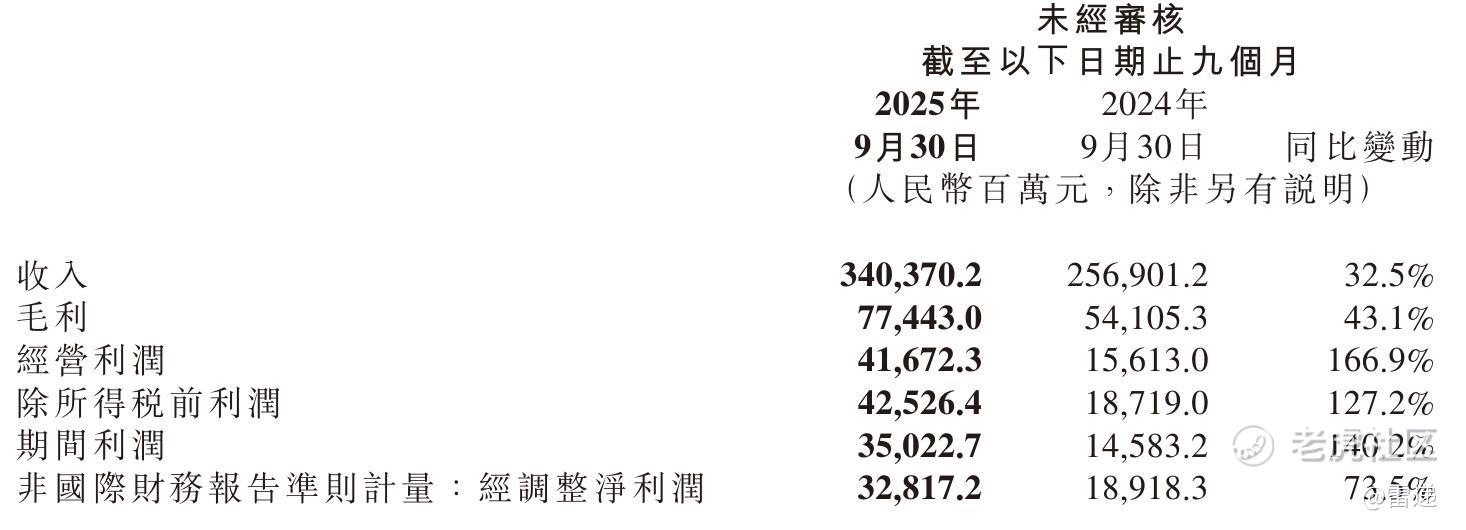 小米集团2025年前9个月期内利润为350亿元,较上年同期的145.83亿元增长140.2%;经调整净利为328.17亿元,较上年同期的189.18亿元增长73.5%。