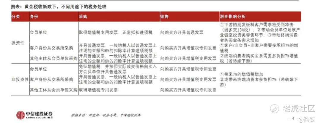 中信建投的研报显示,对于非投资类的黄金企业(如饰品、工业用途),因进项税抵扣减少(由13%降至6%),对于成本端或有所提升,结合当下金价,预计成本增加在60元/g+。