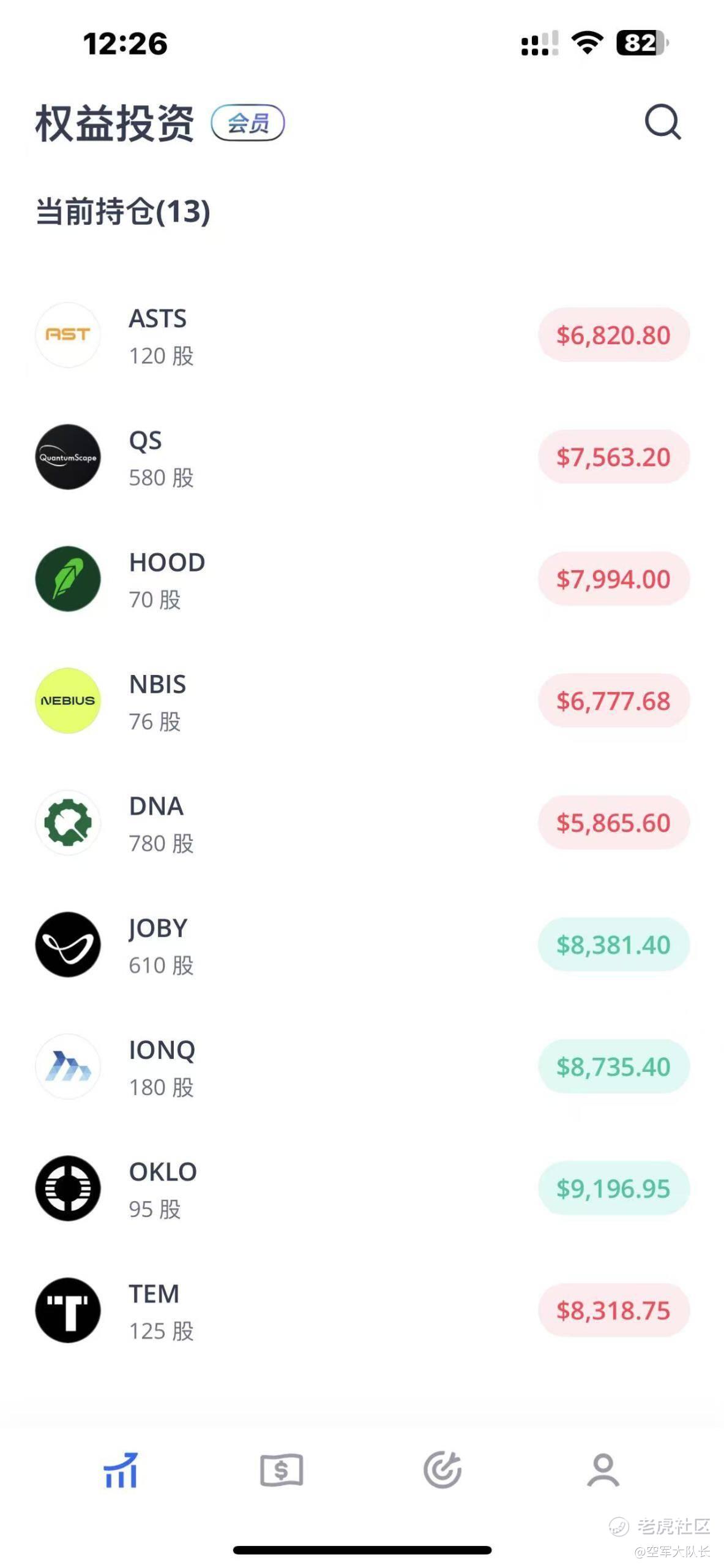 这是我的实盘账户,只有9.6万美元了,整体亏了4%,我每个股票都是一万美元,不到一万美元的都是亏的,当然买这13个股票的时候是13万美元,现在只有9万多美元了,我这个账户是10万美元开始的,最高涨到了15万美元,现在还亏钱了,做成长股的波动是非常大的,一般人受不了这个波动的,我不怕,因为我对自己非常自信,我有百分百的把握让这个账户后面赚钱,因为13个股票不可能都不涨的,总会碰到几个大涨了,当然也会有几个大跌的,但是只要整体赚钱就可以了,我不马后炮,我天天发实盘,大家可以长期关注我的实盘账户。