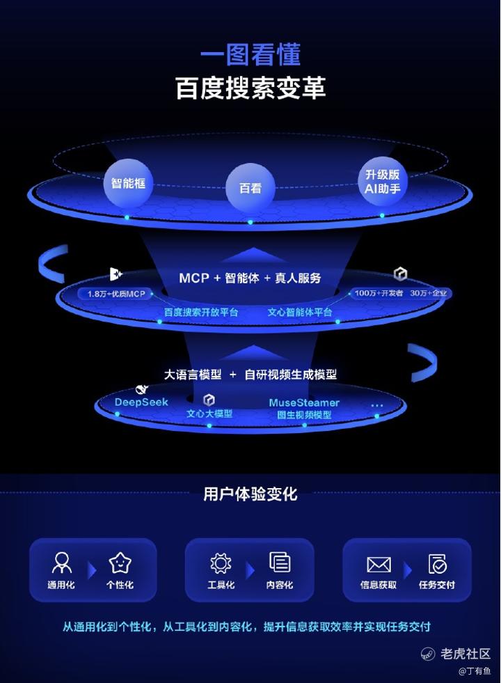 今年7月,搜索框进行了十年最大改版,让用户可以输入长文本、多模态内容,一键调AI写作、作图、生成视频,结果页也从文字链接变成AI回答、多模态内容、智能体服务,强调富媒体的概念。