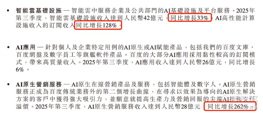在这一逻辑下,文库、网盘和GenFlow组成的AI应用线,其实是“搜索往下延伸到生产力”的自然结果。Q3AI应用收入达到26亿元。