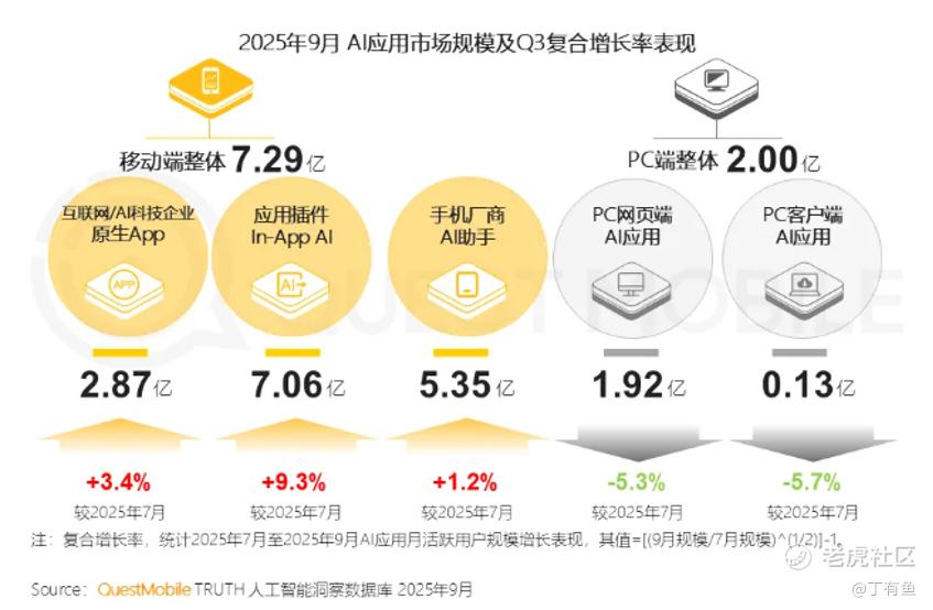 从整个中国AI行业的背景看,QuestMobile的《2025年三季度AI应用行业报告》显示,截至2025年9月,中国移动端AI应用用户规模已经突破7.29亿,其中In-AppAI月活达到7.06亿,超过原生App两倍,主战场已经从新AIApp切换成老App加AI功能。