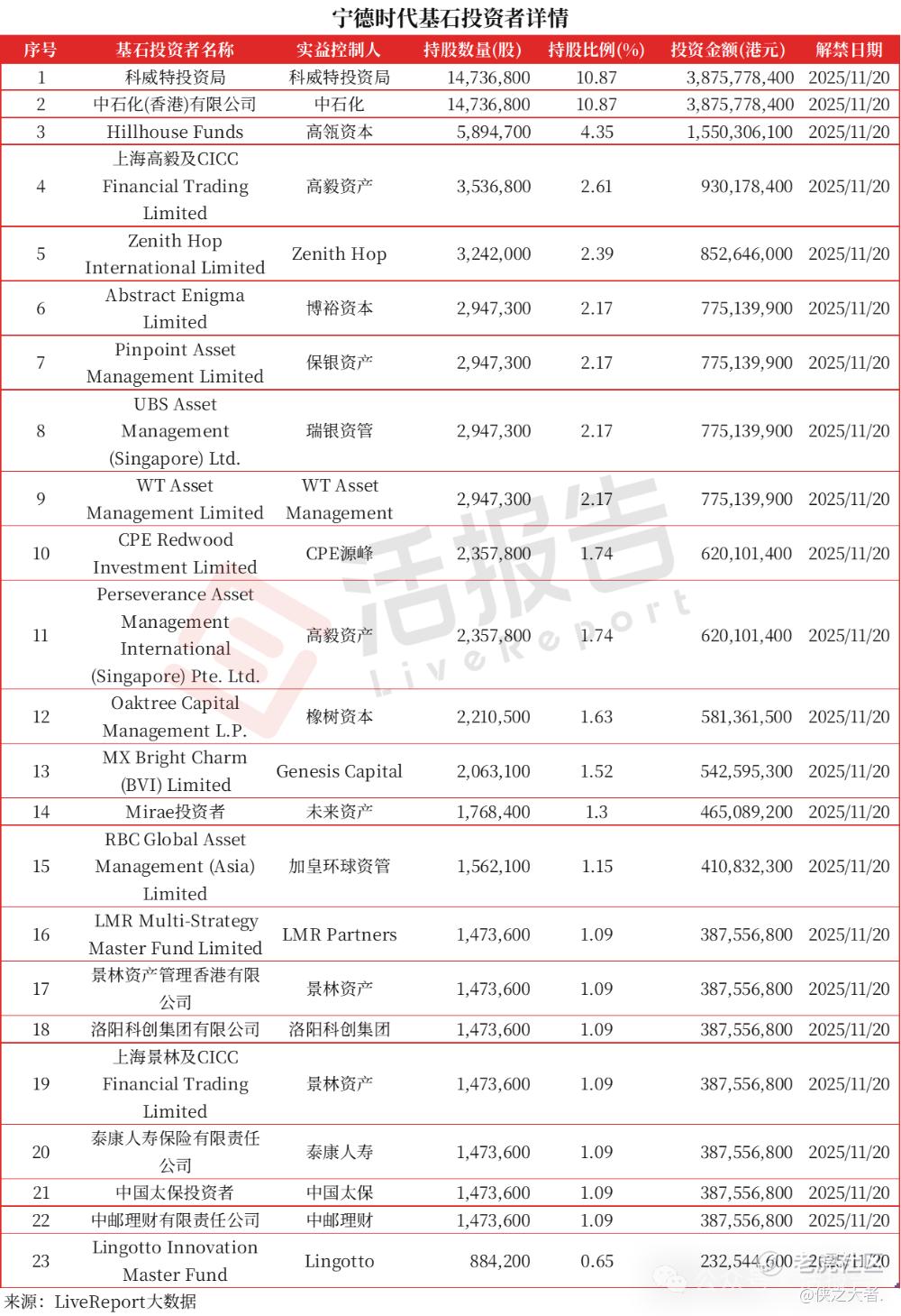 宁德时代(3750.HK/300750.SZ)于2025年5月20日在港上市,IPO募资达410亿港元,其中23家基石合计投资金额高达203.7亿港元,占全球发售股份的比例达到57.13%。