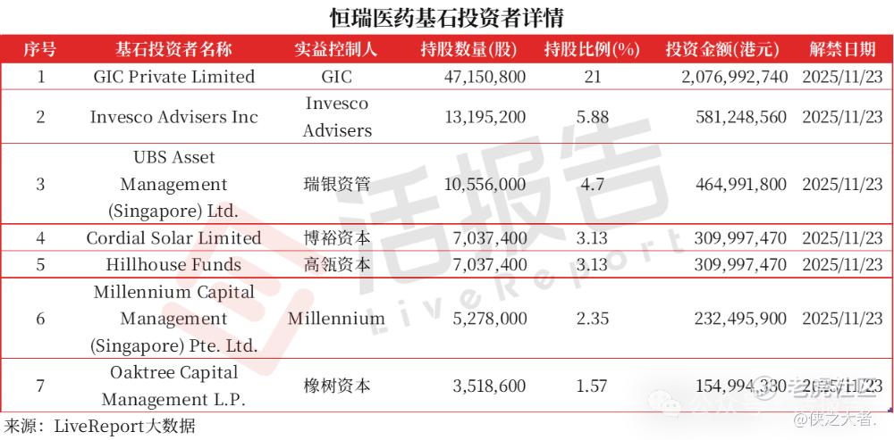 恒瑞医药(1276.HK/600276.SH)于2025年5月23日在港上市,IPO募资113.7亿港元,其中7家基石(博裕资本、GIC、高瓴资本、Invesco Advisers、Millennium、橡树资本、瑞银资管)合计投资了41.3亿港元,占全球发售股份的41.77%。