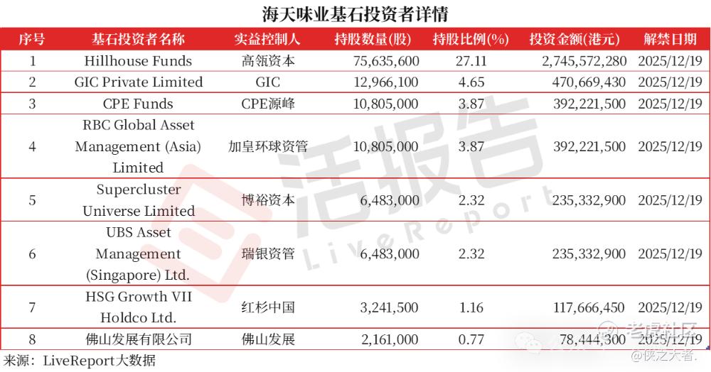 海天味业(3288.HK/603288.SH)于2025年6月19日在港上市,IPO募资105.7亿港元,其中8家基石合计投资金额达46.7亿港元,占全球发售股份的46.08%。