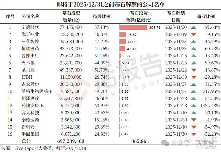 截至2025年11月18日,未来一个多月中将有约16家公司将面临基石投资者股份解禁压力,包括宁德时代、恒瑞医药、海天味业、三花智控等巨头,涉及的基石投资金额达366亿港元。