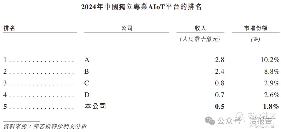 2024年,独立专业AIoT平台**国AIoT市场的约24.5%,市场规模约人民币274亿元。公司录得收入约人民币520.0百万元,在该细分市场中排名第五。