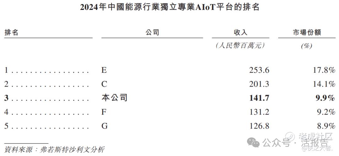 2024年,能源行业独立专业AIoT平台的市场规模约为人民币14亿元。公司从能源行业消费者取得收入约人民币141.7百万元,在该细分市场中排名第三。