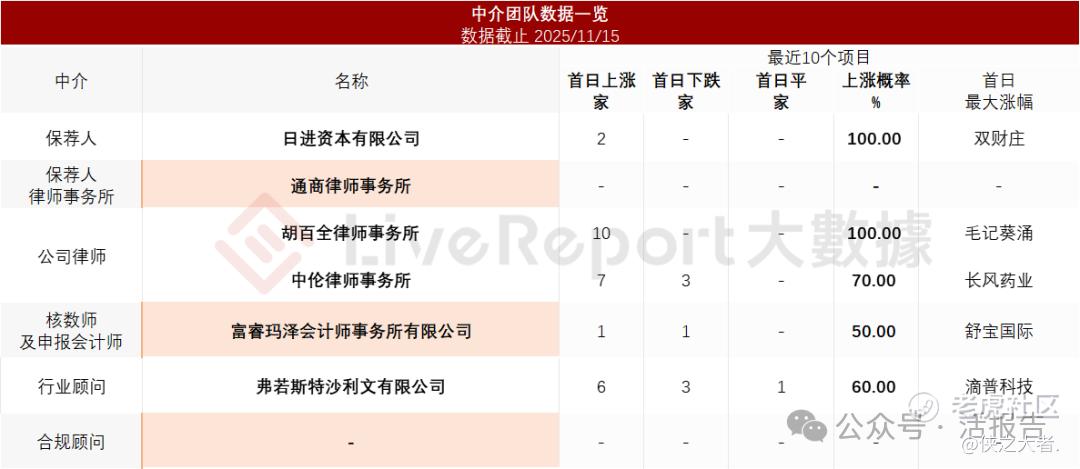 据**大数据统计,德风新征程中介团队共计6家,其中保荐人1家,近10家保荐项目数据表现不错;公司律师2家,综合项目数据整体表现不错。整体而言中介团队历史数据表现尚可。
