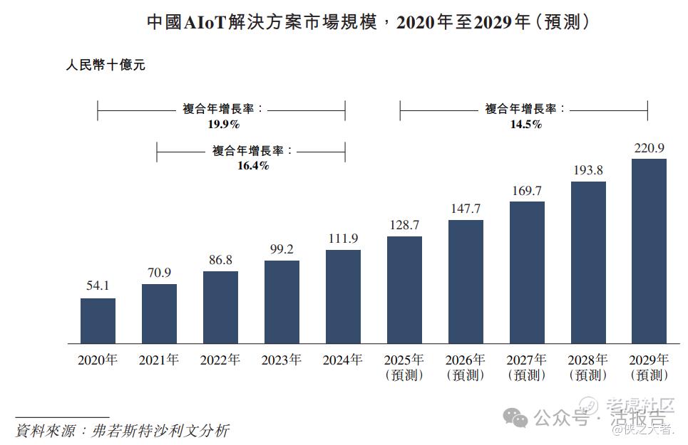 根据弗若斯特沙利文(Frost & Sullivan)的报告,中国AIoT市场近年来增长迅猛,其规模由2020年的约人民币541亿元扩大至2024年的约人民币1,119亿元,预计于2029年将达到约人民币2,209亿元。