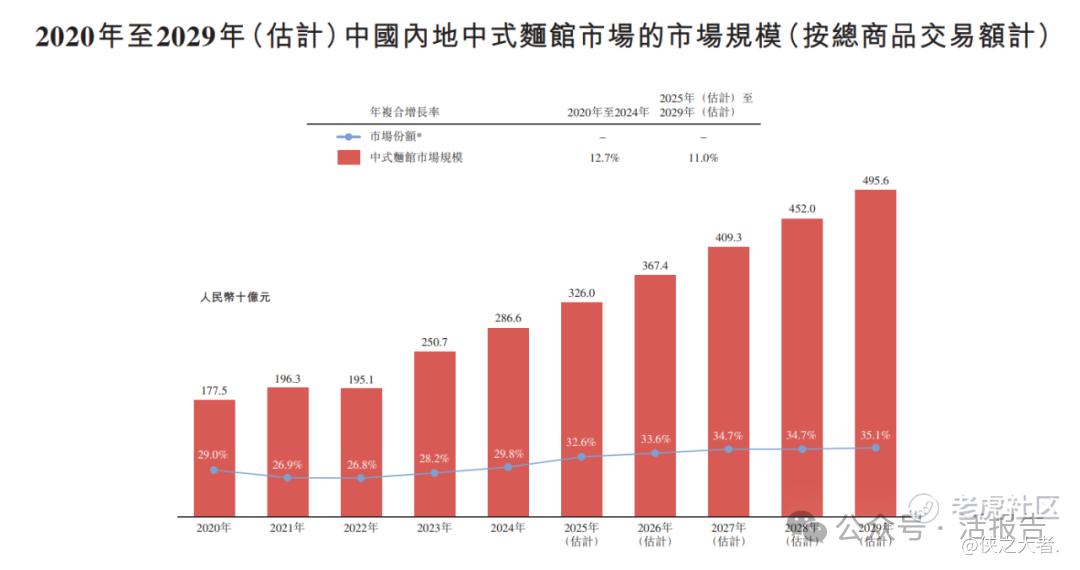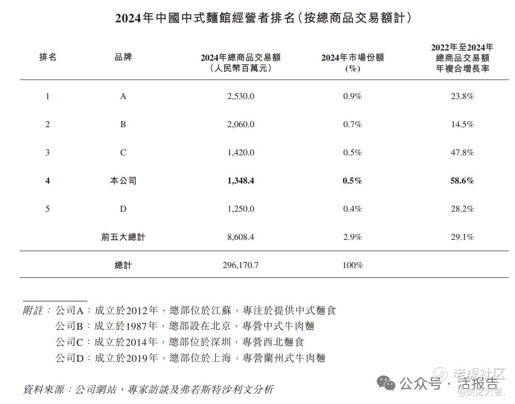 根据弗若斯特沙利文(Frost & Sullivan)资料,2024年,按总商品交易额计,该公司为第四大中式面馆经营者,市场份额为0.5%。值得注意的是,按总商品交易额计,公司亦为最大的川渝风味面馆经营者, 且2022年至2024年连续三年,在中国所有餐饮连锁企业中,重庆小面、红碗豌杂面和金碗酸辣粉的线下销量排名第一。