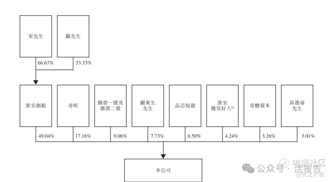 IPO前,遇见小面在上市前的股东架构中,控股股东宋奇先生、苏旭翔先生、淮安创韬、淮安遇见好人等,合计持股约53.28%。(淮安创韬持股为49.04%,淮安遇见好人/雇员激励平台持股为4.24%)