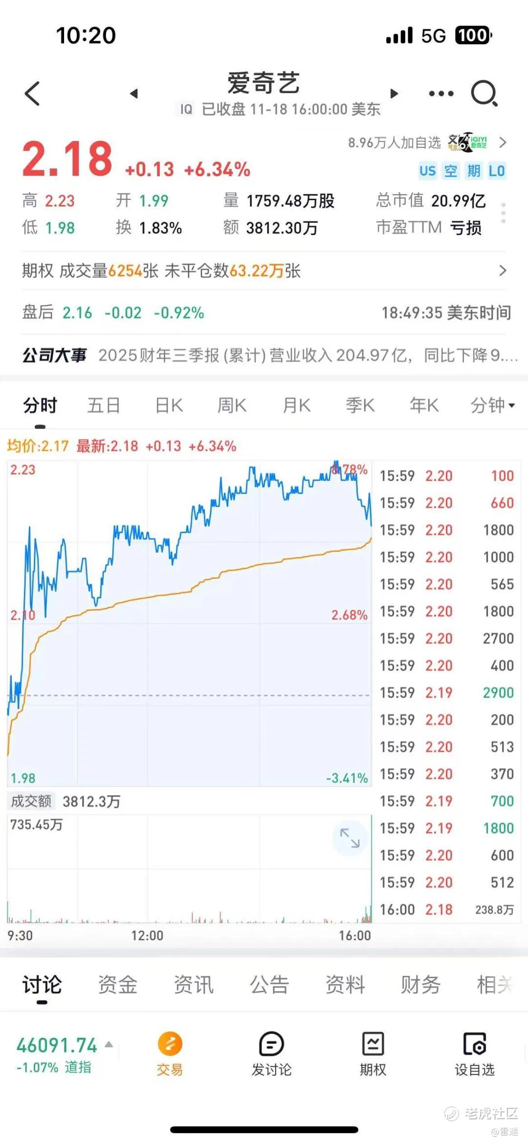 截至今日收盘,爱奇艺股价大涨超过6%,股价为2.18美元,市值为21亿美元。