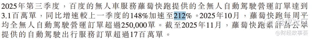 2025年Q3,萝卜快跑提供的全无人自动驾驶订单飙涨到310万单,同比增速较Q2的148%加速至212%。