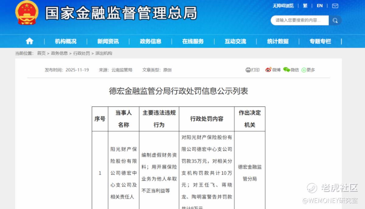 此案并非孤例。2025年以来,阳光保险旗下子公司因频繁违规屡遭监管重罚。据不完全统计,截至2025年9月,阳光保险旗下阳光财险与阳光人寿共收到近30张罚单,总罚金超过500万元,40余名责任人被追责。