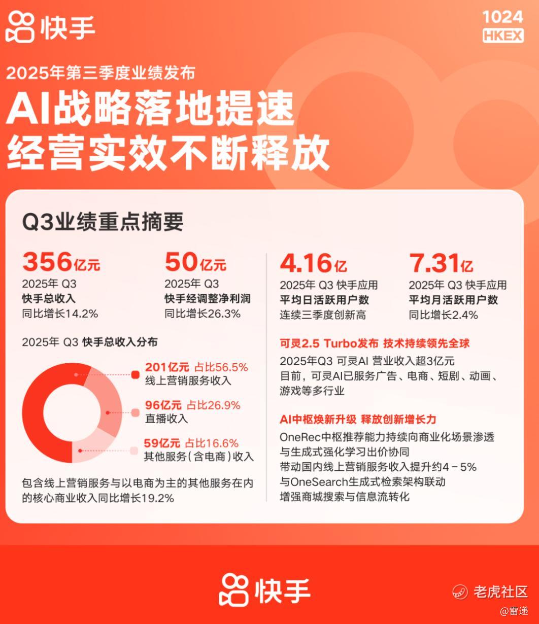 电商业务方面,第三季度,快手电商GMV同比增长15.2%至3850亿元。平台通过多元惠商政策、全域流量扶持与智能工具赋能,帮助商家在快手构建“公域拓客、私域沉淀”的全域经营体系,电商活跃用户复购频次同比持续提高,信任电商生态下的用户粘性进一步增强。
