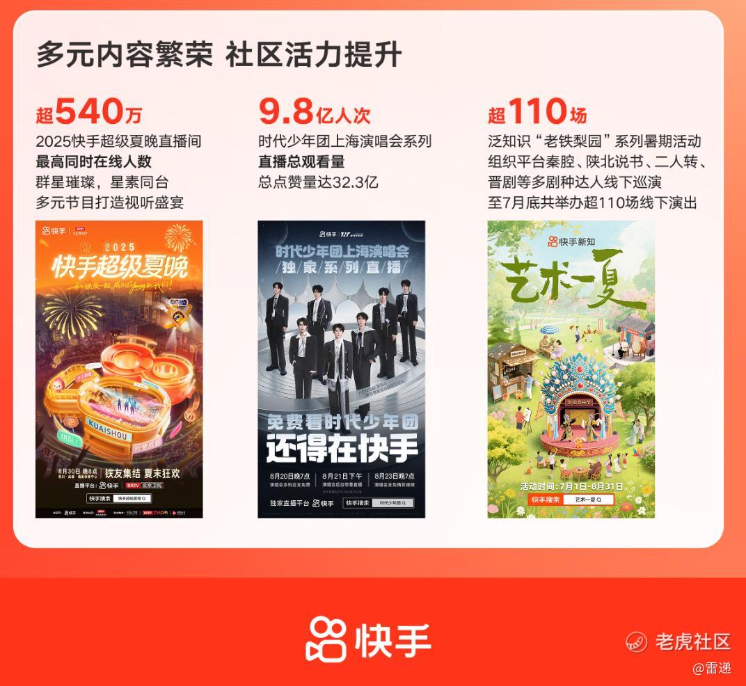 在内容生态建设方面,快手通过多元内容供给和重点运营活动持续提升用户体验。本季度,平台联合北京卫视推出“2025 快手超级夏晚”,直播间最高同时在线人数超过 540 万;面向年轻用户群体推出的时代少年团上海演唱会系列直播,直播间总观看量达 9.8 亿次。此外,泛知识“老铁梨园”系列暑期活动以秦腔、陕北说书等多剧种形式走入线下,带动传统文化题材内容在平台进一步破圈,也为相关垂类创作者扩大曝光空间。