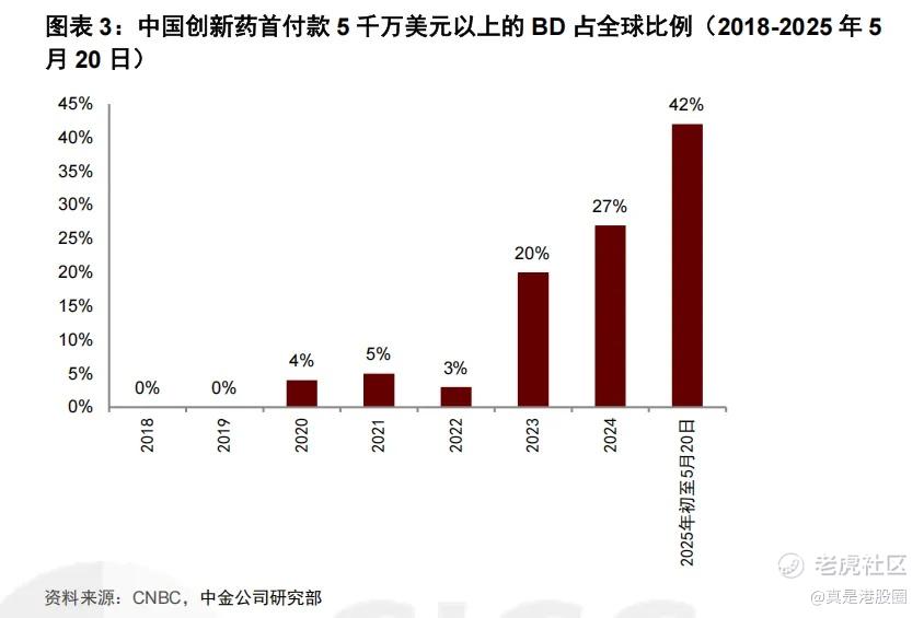 根据 CNBC,截至 2025 年 5 月20 日,首付款 5 千万美元以上的 BD 中中国占全球比例高达 42%,2024 年这一比例为 27%,而 2019 年时这一比例还是 0%。