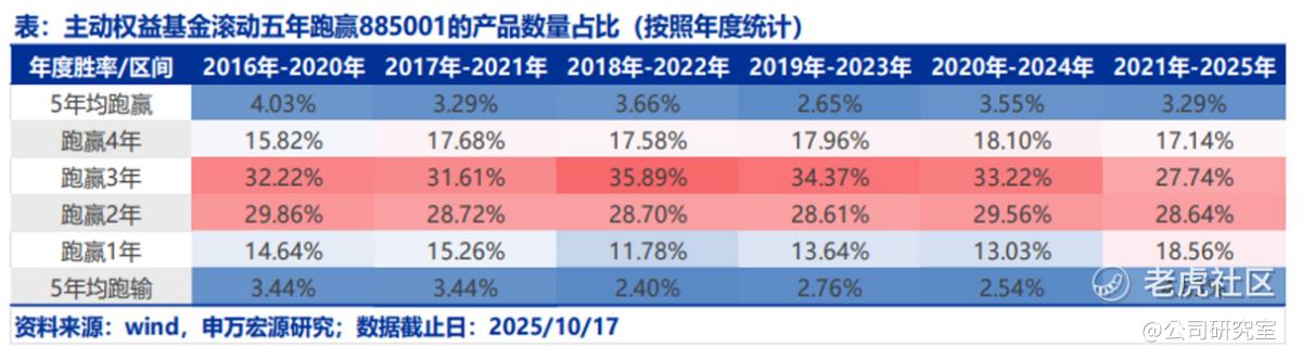 根据申万宏源的研报,2020年到2024年这5年时间里,主动权益基金跑赢Wind偏股混合基金指数1年的比例有13.03%,跑赢2年的比例上升到29.56%,跑赢3年的比例最高为33.22%,但跑赢4年的下降到18.10%,5年均跑赢指数的只有3.55%。