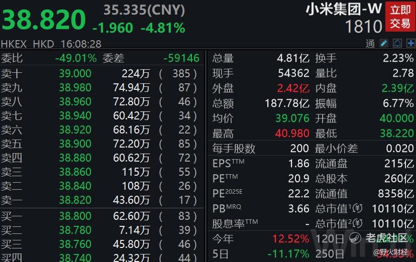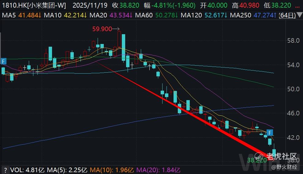 时间放得更长,小米净利润已经连续7个季度环比创下新高。不过,遗憾的是,其财报发布后次日(11月19日),股价低开低走,最低至38.22港元,最终收于38.82港元,大跌近5%。