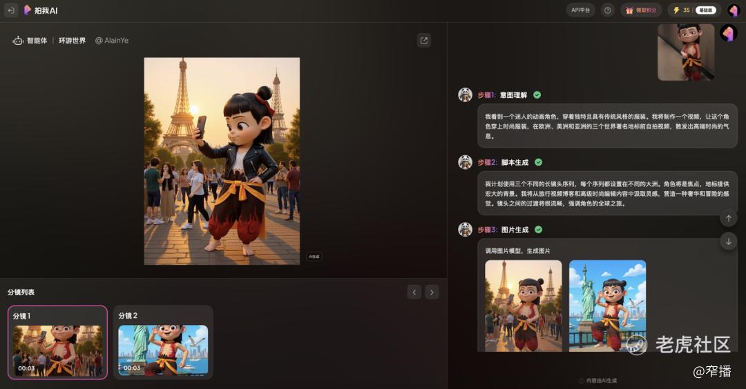 另一方面,在模型能力提升基础上,更适合AI视频创作的工具也不断出现。可灵推出的灵动画布功能,能够像思维导图那样串联起整个创作流程,为AI影像创作者提供了一个一站式的创意工作台。拍我AI则增加了Agent创作助手功能,让用户无需复杂的prompt,也能生成专业级的视频。