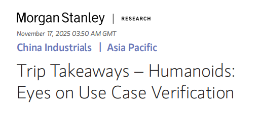 摩根士丹利于11月完成亚太地区人形机器人产业链专项调研,重点走访Fortior(1304.HK)、兆威机电(003021.SZ)、优必选(9880.HK)等6家核心企业,聚焦订单交付进度、应用场景反馈、技术迭代方向及产业链盈利逻辑。