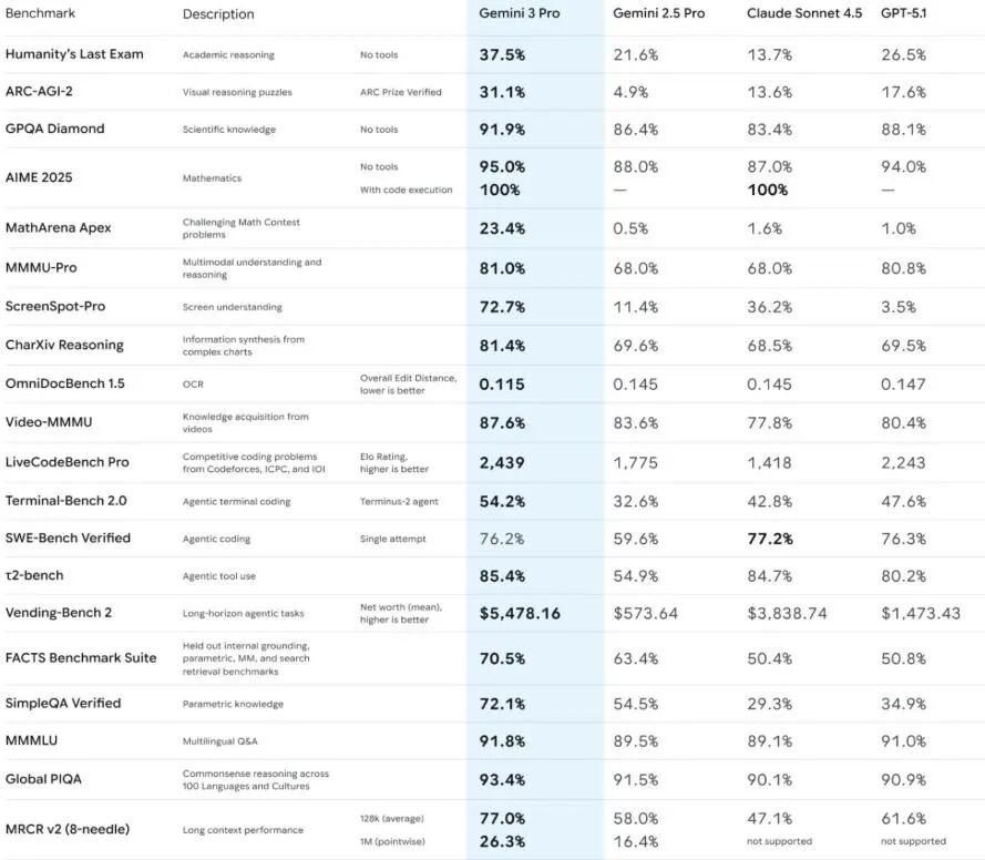 谷歌表示,在衡量人工智能模型性能的多个热门行业排行榜上,Gemini 3 处于绝对领先地位,该模型还在数学、多模态理解和事实准确性等多个维度刷新了大模型业内纪录。