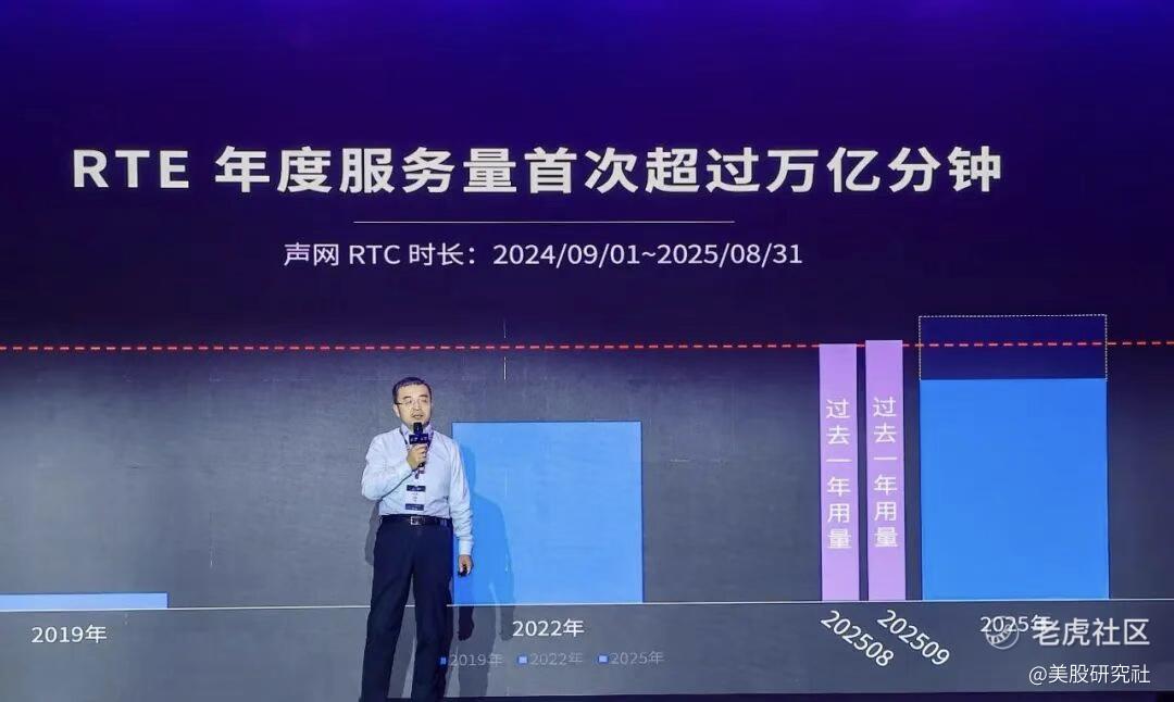 在主论坛开场演讲中,赵斌宣布,声网年度服务分钟数首次突破 1 万亿分钟,标志着实时互动正式进入全新的规模化应用阶段。