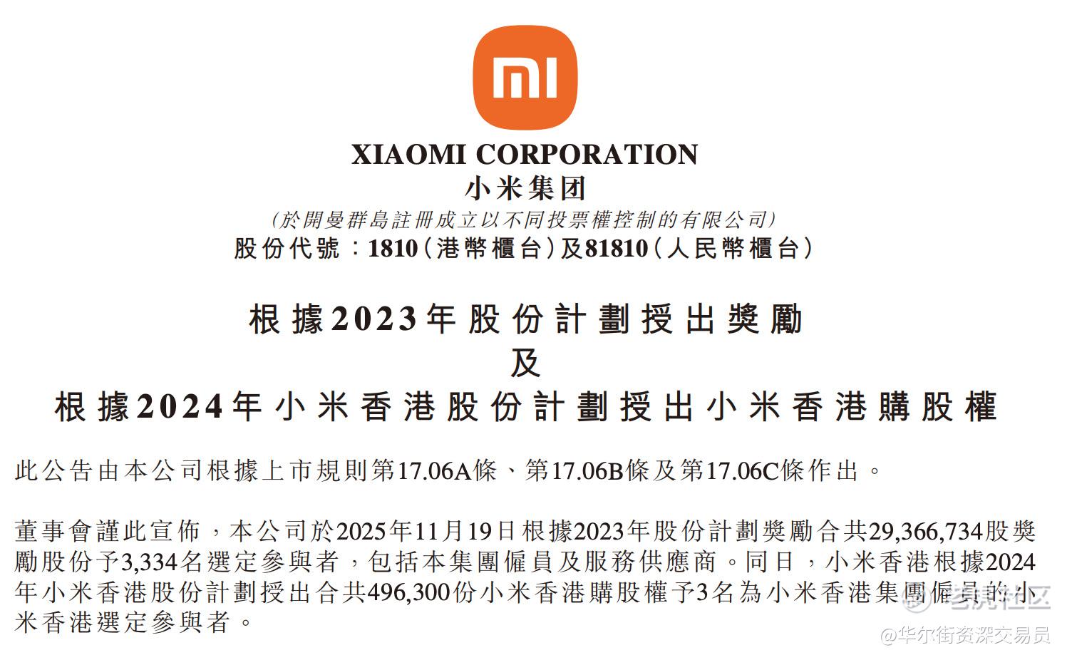 小米集团-W(01810.HK)发布公告宣布,公司根据2023年股份计划奖励合共29366734奖励股份予3334名选定参与者,包括集团雇员及服务供应商。以小米集团当日的港股收盘价每股38.82港元测算,本次授予股份的总价值约11.4亿港元。