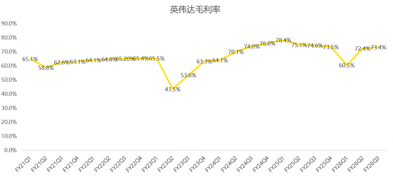 收入超预期下,英伟达三季度毛利率为73.4%,略低于分析师的预期: