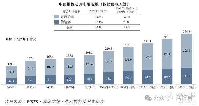 根据弗若斯特沙利文(Frost & Sullivan)的报告,2020年,中国模拟芯片市场规模为人民币1,211亿元。到2024年,中国市场规模达到人民币1,953亿元。预计到2029年,中国模拟芯片市场规模将达人民币3,346亿元,2025年至2029年的复合年增长率为11.0%。