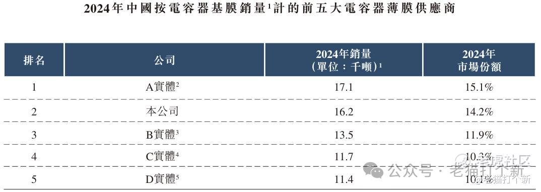 2024年的电容器基膜销量计,公司是中国第二大的电容器薄膜制造商,市场份额为14.2%。