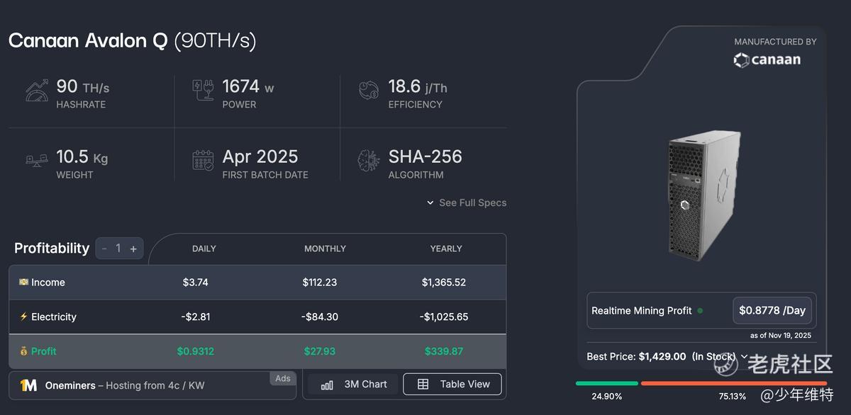如果换成家用款,以Avalon Q为例,按照Mining NOW的算法,按照0.07USD/kWh(国内差不多0.5元/kWh)计算,年化300刀左右的收入,基本上3-5年回本。