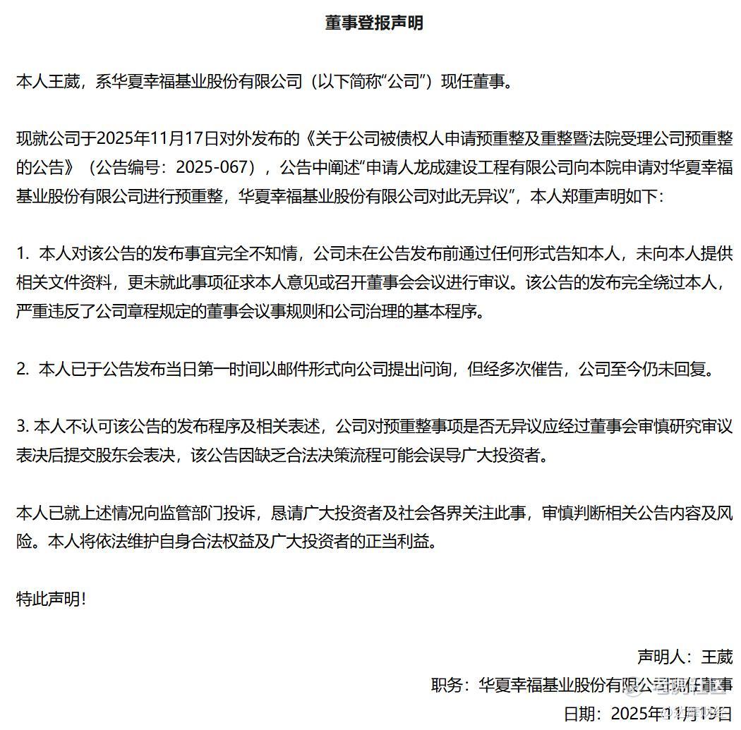 华夏幸福董事王葳发布登报声明称,对公司预重整相关公告的发布“完全不知情”,且该公告“严重违反了公司章程规定的董事会议事规则和公司治理的基本程序”。王葳表示,本人不认可该公告的发布程序以及相关表述,并已就上述情况向监管部门投诉。