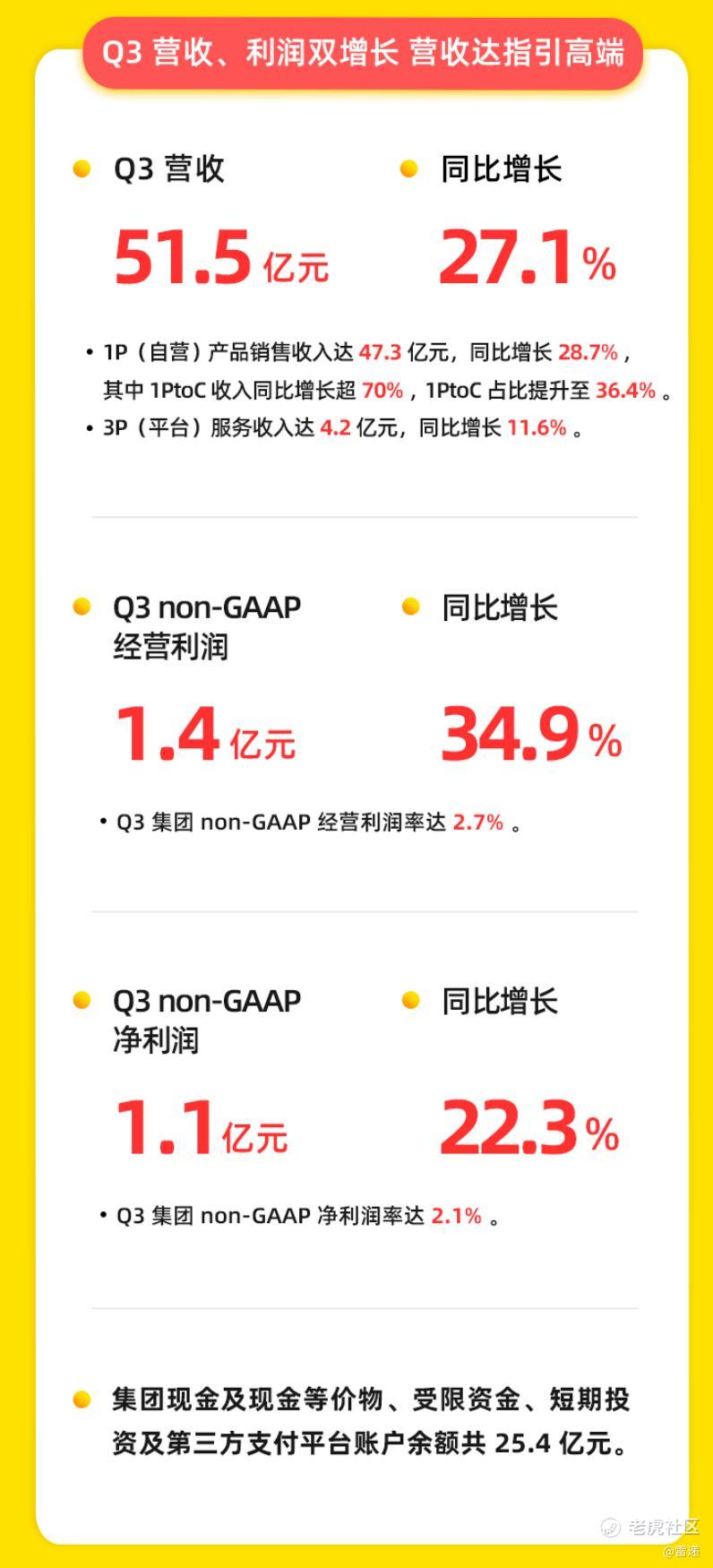 万物新生2025年第三季度总收入51.5亿元,较上年同期的40.5亿元增长27.1%。从营收构成来看,万物新生2025年第三季度1P(自营)产品销售收入达47.3亿元,同比增长28.7%,持续成为营收增长引擎。3P(平台)服务收入为4.2亿元,同比增长11.6%。