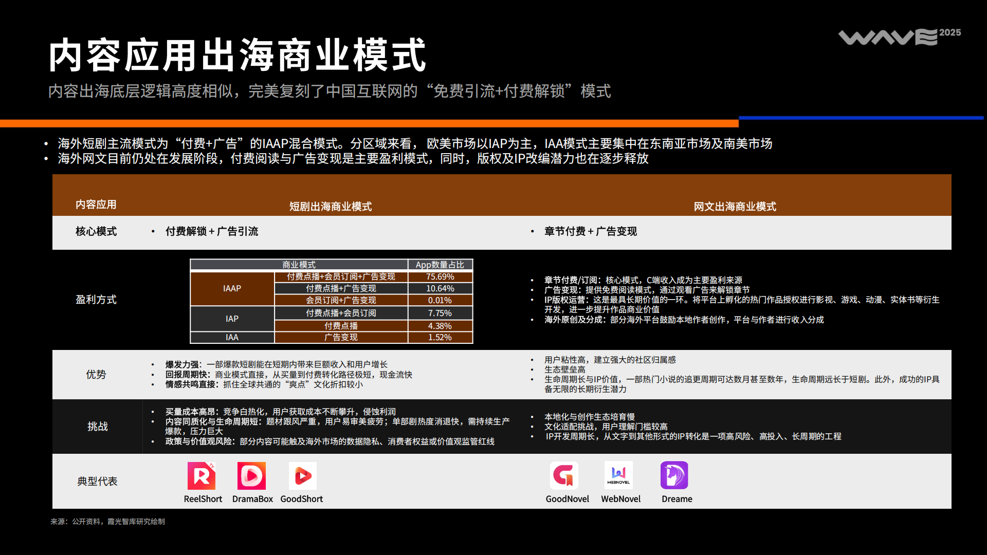 短剧走精品化叙事 + 本土化适配路线,搭配 AI 技术降本,进一步实现出海规模化;网文则通过多语种翻译突破语言壁垒,逐步向本地用户渗透,推动华流内容从流量出海走向文化扎根。