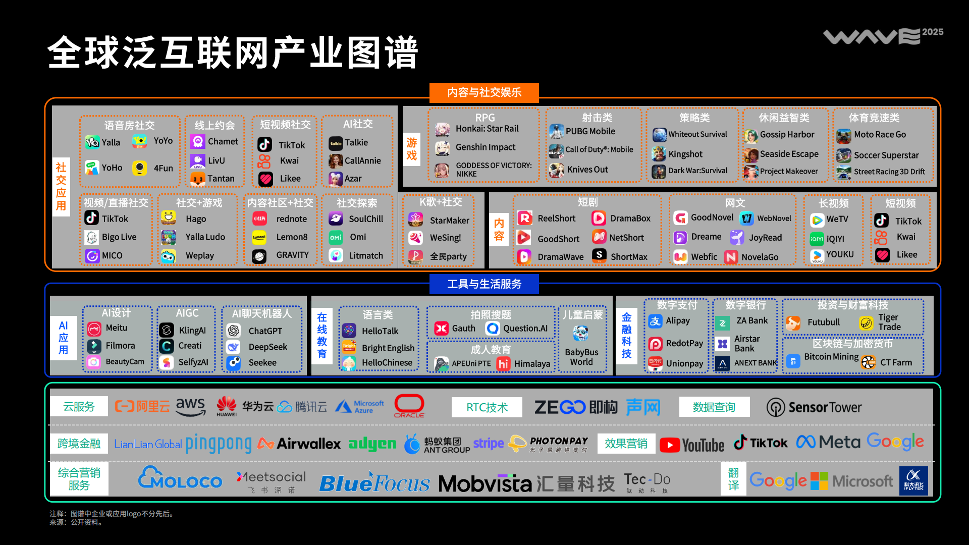 这张图呈现的就是,全球泛互联网产业图谱。从上游的内容与社交娱乐应用,到下游的技术服务、金融科技与数字营销服务,清晰展示了中国互联网企业出海的概况。