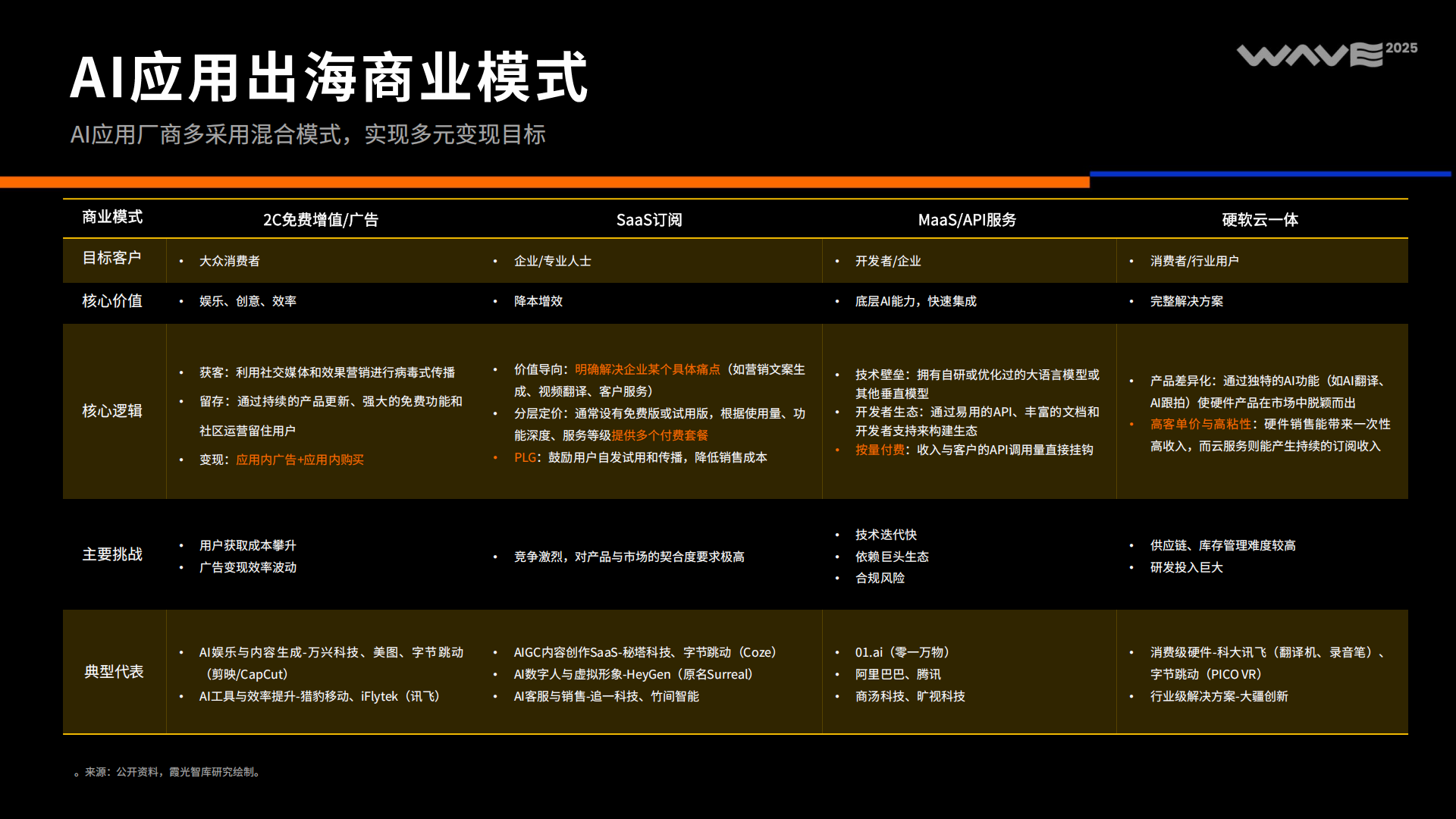 从商业模式上来看,在实际工作中,因目标客户而异,AI应用出海多采用混合盈利模式。