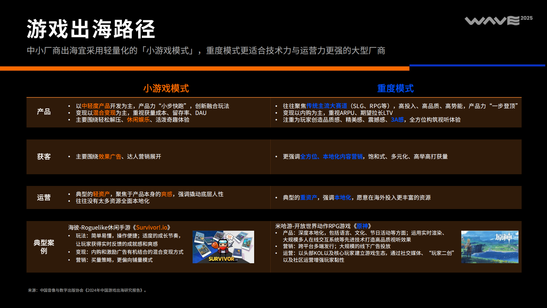 从路径来看,中小厂商出海更适合采用轻量化的小游戏模式;而技术力与运营力更强的大型厂商更适合重度模式。