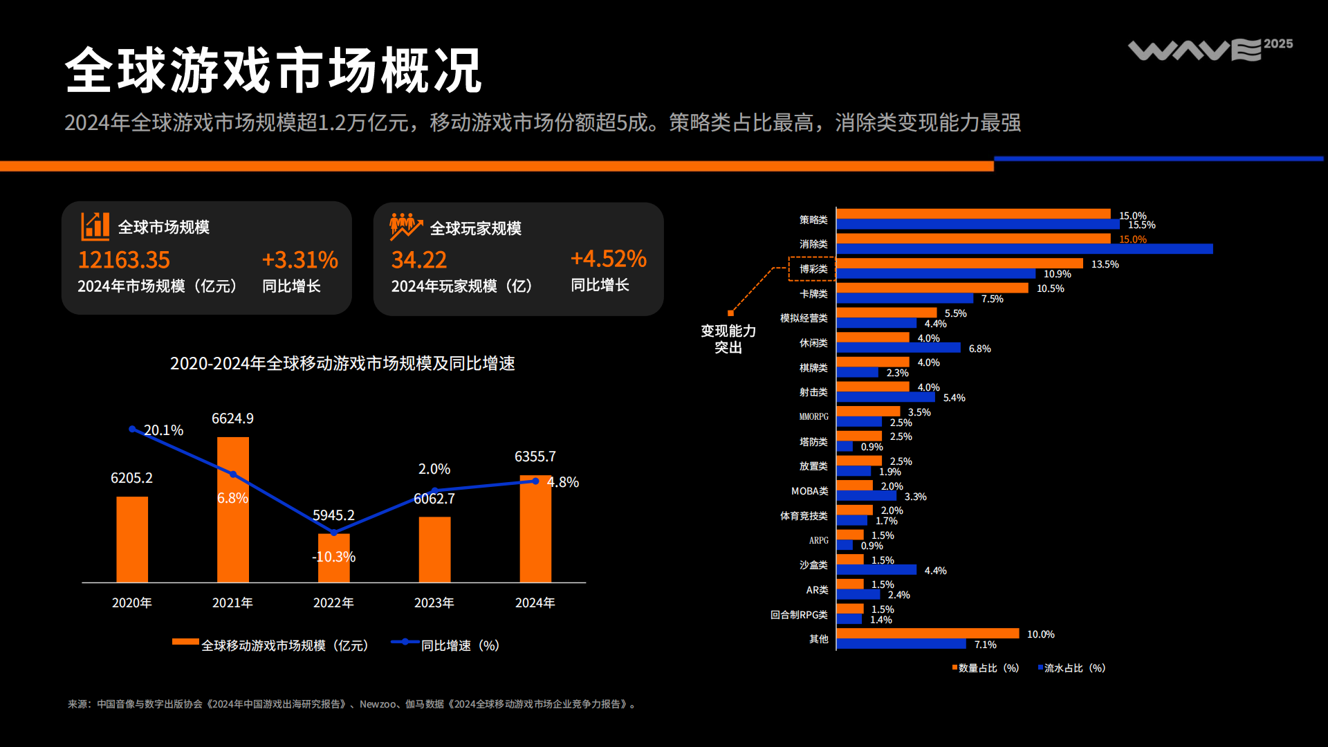 2024年,全球游戏的市场规模超过了1.2万亿,移动游戏市场份额已经超过了一半。右侧这一栏是流水TOP200移动游戏类型,可以看到消除类游戏的变现能力最强,占总流水的20.6%。
