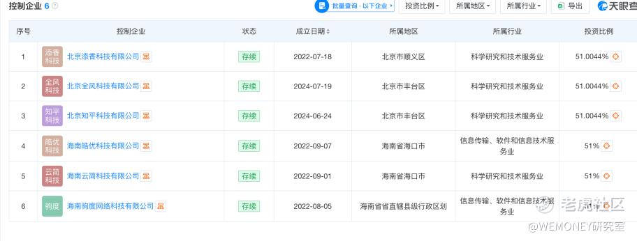 企业信息查询平台显示,鸿源小贷通过股权关系控制着6家科技公司,其中包括北京全风科技有限公司、北京添香科技有限公司等。值得注意的是,鸿源小贷对这些关联公司的持股比例都被精准地控制在51%,形成控股但非全资的局面。