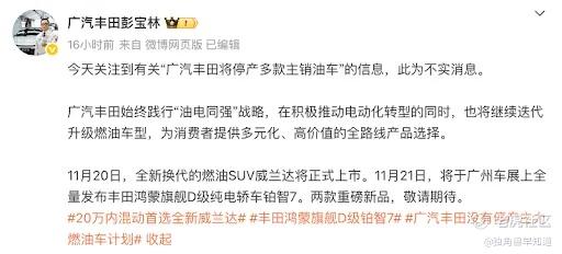 广汽丰田高管回应“将停产多款主销油车”:不实消息