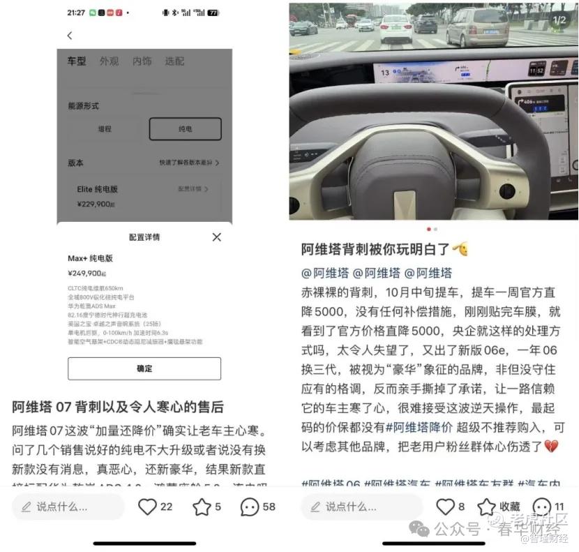 社交平台上,大量车主抱怨被“降价增配”背刺,有车主提及提车阿维塔06不到半月即遭遇官方降价,品牌的价格策略严重伤害了早期用户信任。