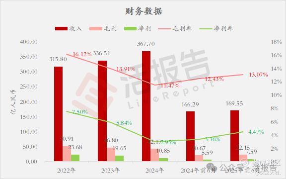 收入分别约为人民币315.80亿、336.51亿、367.70亿、166.29亿、169.55亿,2025年前6月同比+1.96%;