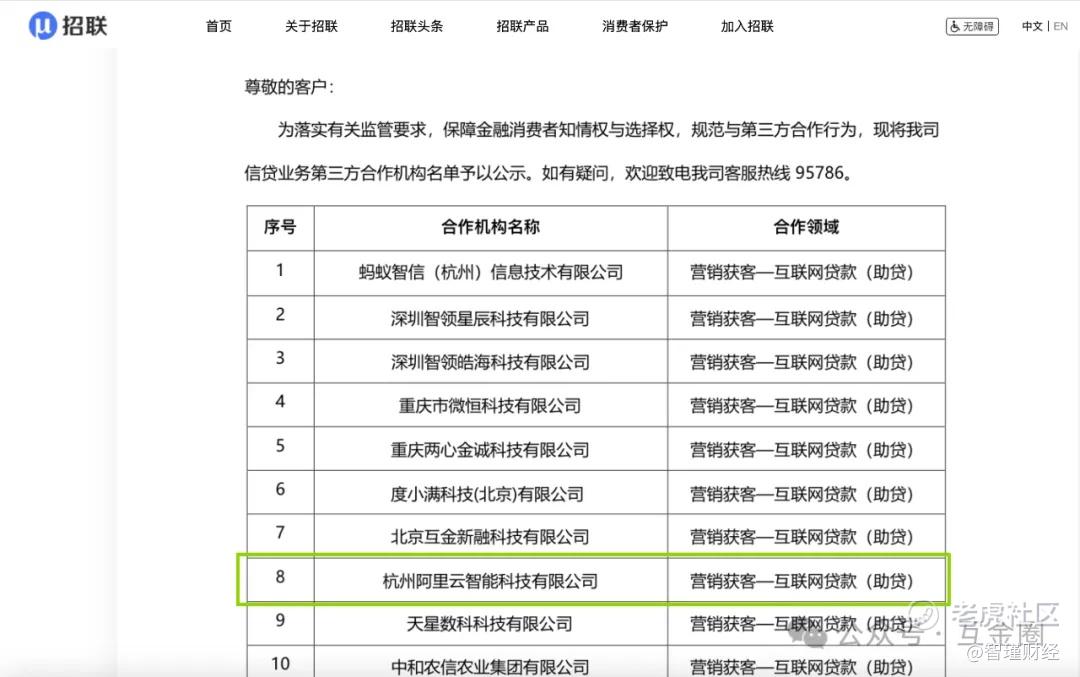 在招联消金官网披露的信贷业务三方合作名单列表中,可以清晰地看到“阿里云”与招联消金的合作领域为:助贷(营销获客——互联网贷款)。