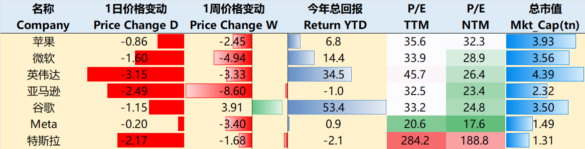 大科技本周在英伟达财报后普遍回调,但仍有分歧。至11月20日收盘,过去一周 $苹果(AAPL)$ -2.45%, $微软(MSFT)$ -4.94%, $英伟达(NVDA)$ -3.33%, $亚马逊(AMZN)$ -8.6%, $谷歌(GOOG)$ +3.91%, $Meta Platforms, Inc.(META)$ -3.4%, $特斯拉(TSLA)$ +1.68%.