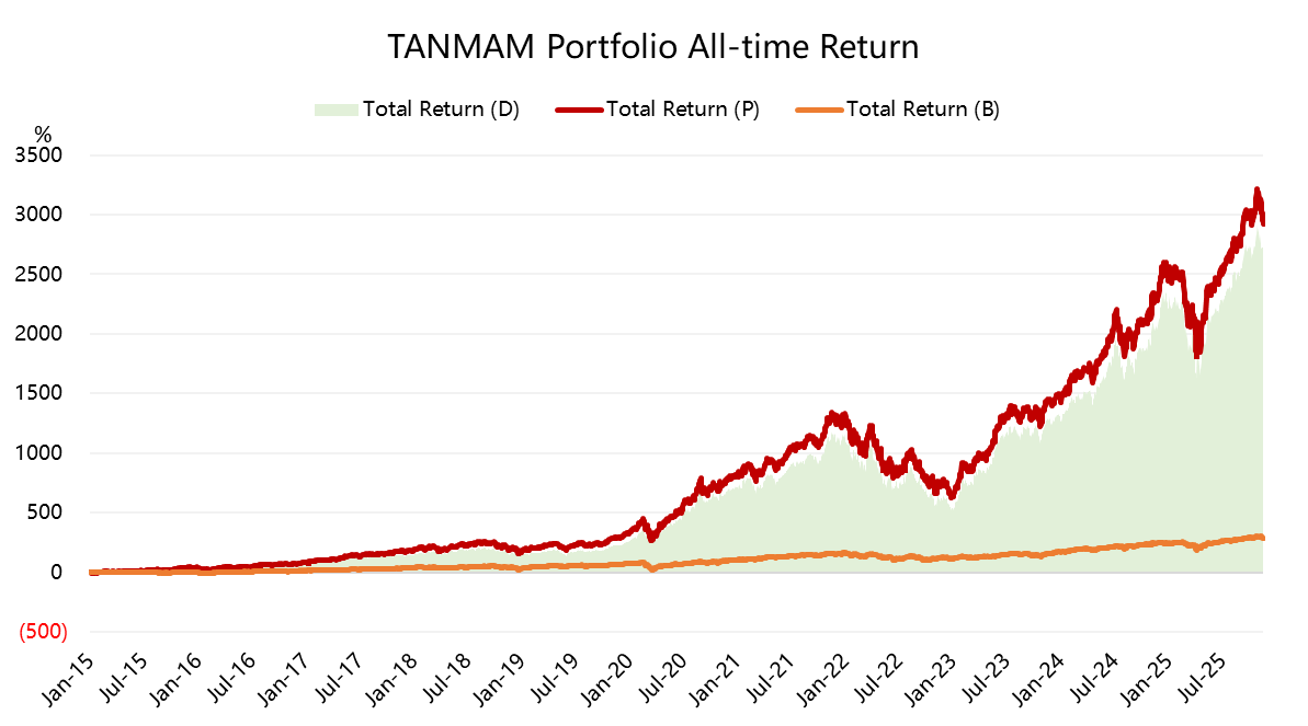 七巨头(Magnificent Seven)组成一个投资组合(“TANMAMG”组合),等权重、每季度重新调整权重。回测结果从2015年以来表现是远超 $标普500(.SPX)$ 的,总回报达到了3075.39%,同期 $标普500ETF(SPY)$ 回报292.13 %,超额收益2783.26%,仍然在高位。